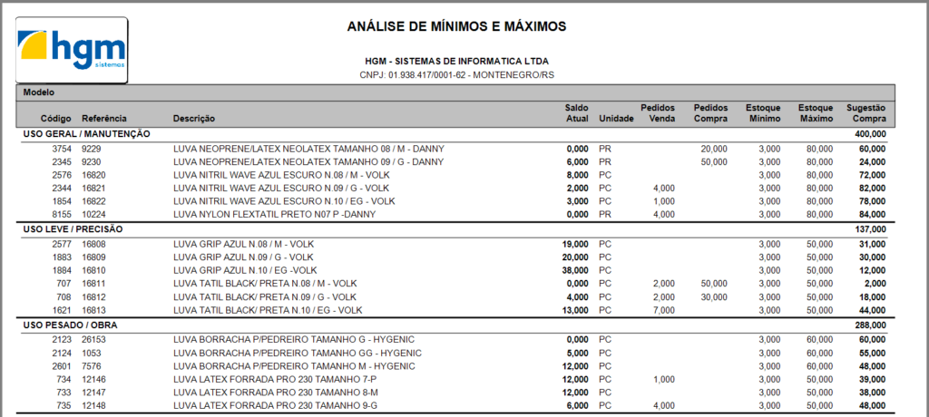 Após a geração, o relatório apresenta informações detalhadas de cada item, incluindo código, descrição, saldo atual, unidade, pedidos de venda e compra, além dos valores configurados de estoque mínimo e máximo. Com base nesses dados, o sistema calcula e exibe a sugestão de compra, facilitando o processo de reposição.