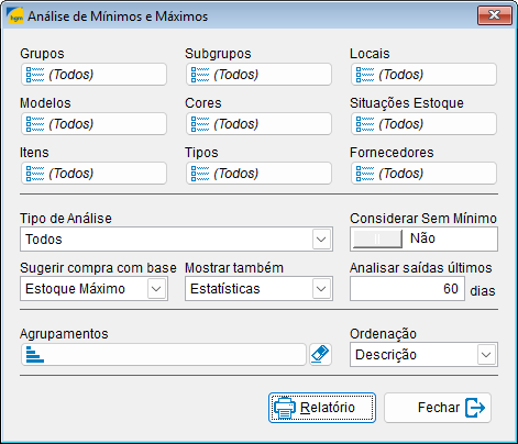 Outro ponto importante é o tipo de análise, que define quais itens serão considerados na geração do relatório. Dependendo da escolha, é possível visualizar todos os produtos ou focar apenas em situações específicas, como itens abaixo do mínimo ou acima do máximo.